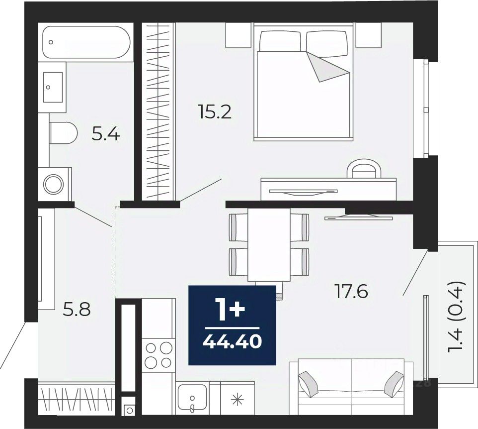 1-комн. квартира с предчистовой отделкой в ЖК "Мириады" на 4 этаже. Общая площадь: 44.4 кв.м., жилая: 15.2 кв.м., площадь просторной кухни-столовой: 17.6 кв.м. Все окна выходят на одну сторону. В квартире один балкон, один совмещенный санузел. Высота потолков 2.7 м.
