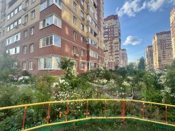 Во дворе благоустроенная территория с детскими и спортивными площадками, ухоженными клумбами и достаточным количеством парковочных мест.