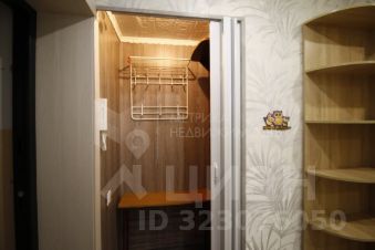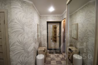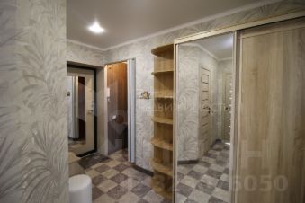 Входная дверь квартиры качественная, с зеркалом. Натяжной потолок матовый, с точечным освещением. Пол покрыт ламинатом с древесными мотивами. Стены оклеены обоями со стильными узорами.