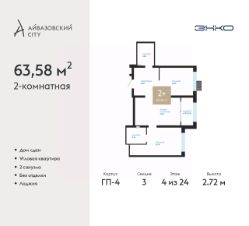 Продается 2-комн. квартира в ЖК "Айвазовский City" на 4 этаже. Квартира без отделки, полностью готова к чистовой отделке и дальнейшему ремонту. Общая площадь: 63.58 кв.м., жилая: 26.79 кв.м., площадь просторной кухни-столовой: 16.67 кв.м. Угловая квартира, очень светлая, естественная вентиляция при открытии окон. В квартире одна лоджия, два совмещенных санузла. Высота потолков 2.72 м.