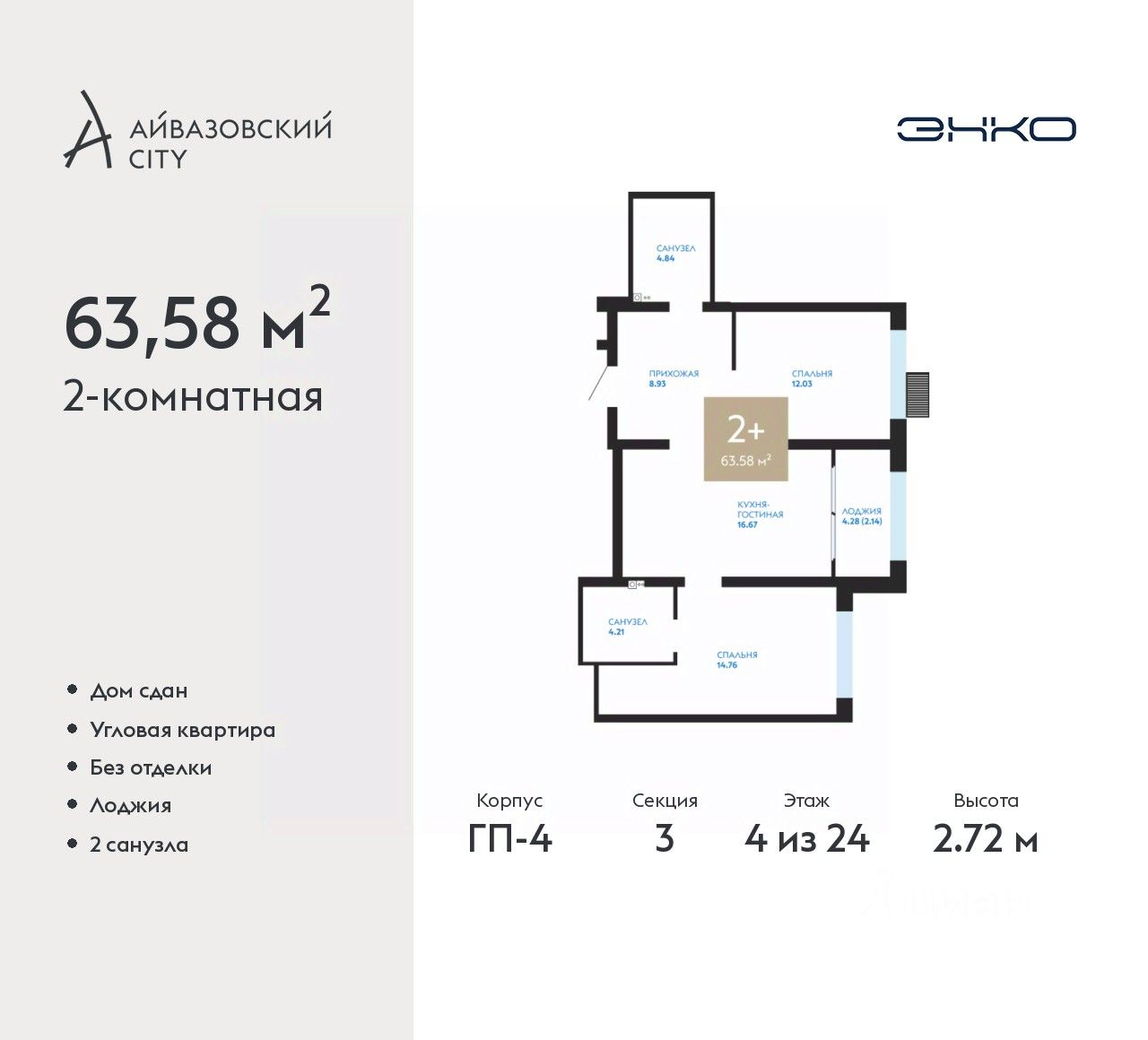Продается 2-комн. квартира в ЖК "Айвазовский City" на 4 этаже. Квартира без отделки, после оформления собственности можно делать ремонт. Общая площадь: 63.58 кв.м., жилая: 26.79 кв.м., площадь просторной кухни-столовой: 16.67 кв.м. Квартира угловая, идеально подойдет любителям тишины и панорамных видов. В квартире одна лоджия, два совмещенных санузла. Высота потолков 2.72 м.