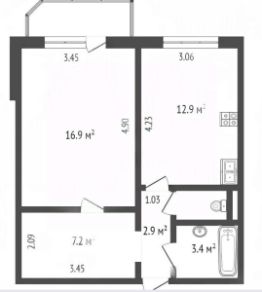 Продуманная планировка: кухня 13 м² и просторная комната 17 м² правильные формы, легко обустроить и создать уют.