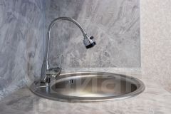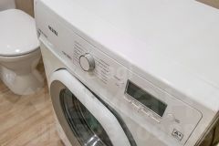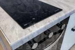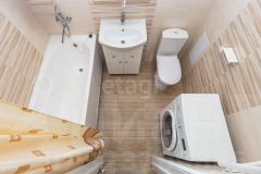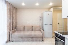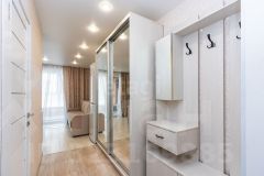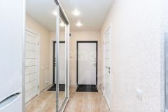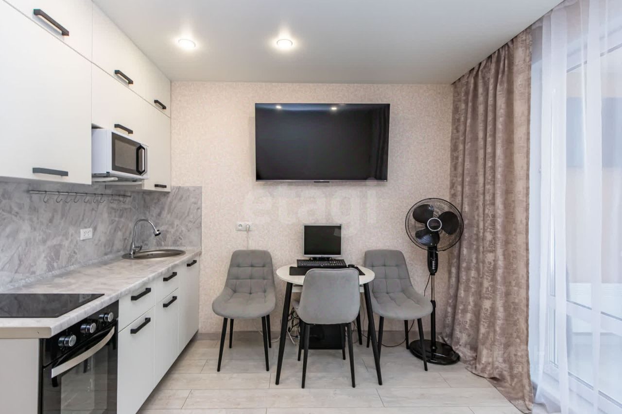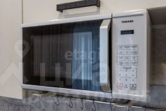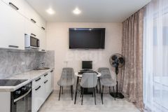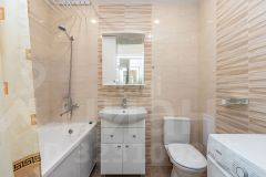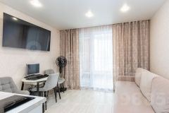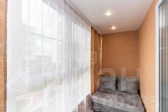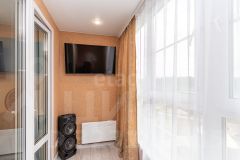В основной комнате натяжной потолок, на полу ламинат и обои на стенах. Кухонный гарнитур с встроенной техникой, обеденный стол и стулья, диван и встроенный шкаф добавляют удобства. Совмещенный санузел отделан керамической плиткой и керамогранитом. Здесь есть натяжной потолок, современная ванная и сантехника. Остекленная лоджия 4 м² — отличное место для отдыха. Стены покрыты декоративной штукатуркой, пол — ламинатом, установлена батарея.