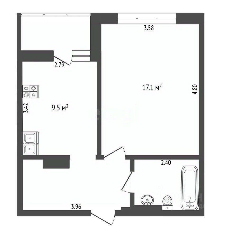 Функциональная планировка- кухня с выходом на лоджию, просторная спальня, коридор с нишей, совмещенный санузел.