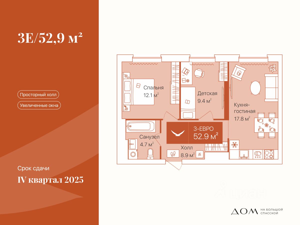 Планировка с двумя отдельным спальнями. Кухня-гостиная и спальня с увеличенными окнами. В холле просторно — есть ниша под шкаф.