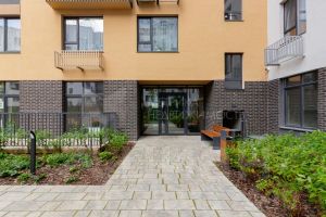 Вечером фасад здания радует архитектурной подсветкой, а уютный домофон в теплом тамбуре создает атмосферу уюта. Просторная колясочная и зона ожидания — дополнительные удобства для жильцов.