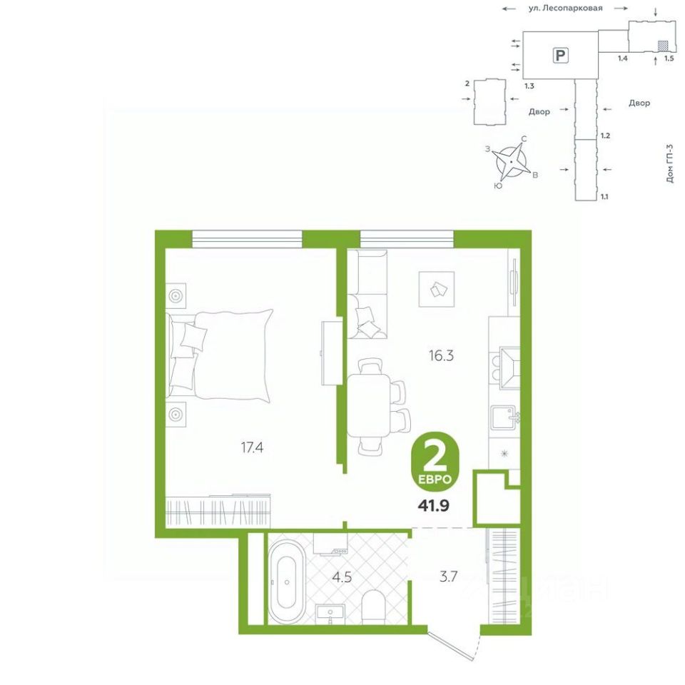 площадь квартиры - 41,9 кв.мГармоничные пропорции и большие окна наполняют пространство светом, создавая уютную атмосферу. Умное зонирование позволяет удобно организовать как рабочую, так и жилую зоны, что особенно важно для современных жителей. Санузел спроектирован с учетом всех потребностей: здесь есть ванна и место для стиральной машины. Каждый метр квартиры используется с максимальной эффективностью, что делает эту планировку отличным выбором для тех, кто ценит комфорт и удобство.
