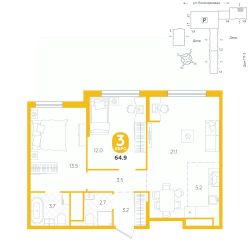 площадь квартиры - 64,9 кв.мГармоничные пропорции и большие окна наполняют пространство светом, создавая уютную атмосферу. Умное зонирование позволяет удобно организовать как рабочую, так и жилую зоны, что особенно важно для современных жителей. Санузел спроектирован с учетом всех потребностей: здесь есть ванна и место для стиральной машины. Каждый метр квартиры используется с максимальной эффективностью, что делает эту планировку отличным выбором для тех, кто ценит комфорт и удобство.