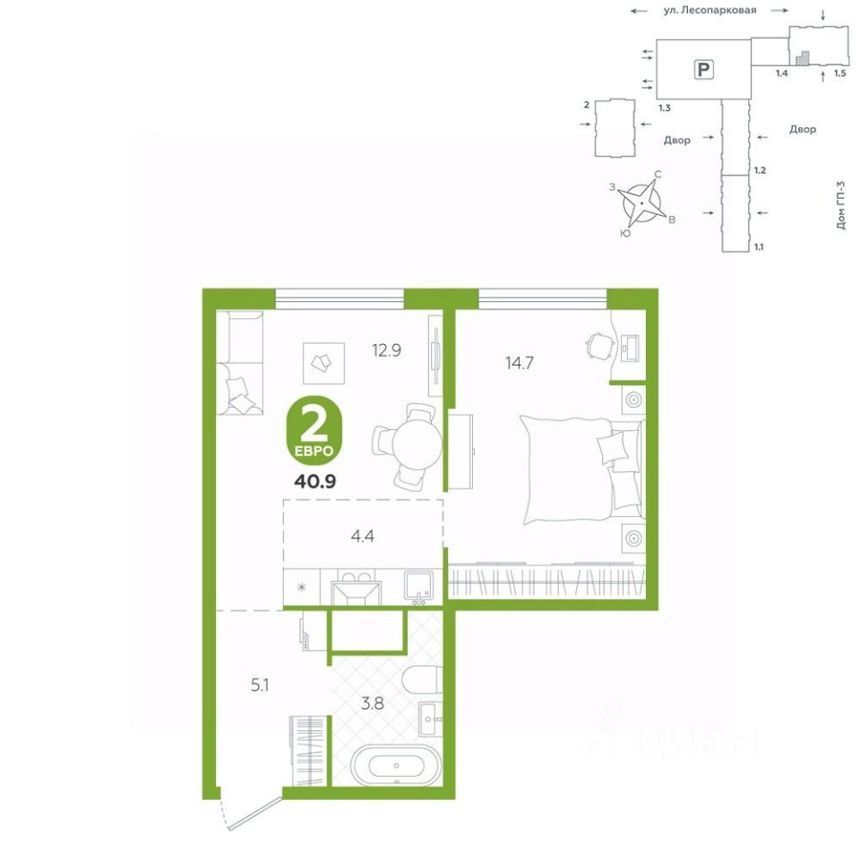 площадь квартиры - 40,9 кв.мГармоничные пропорции и большие окна наполняют пространство светом, создавая уютную атмосферу. Умное зонирование позволяет удобно организовать как рабочую, так и жилую зоны, что особенно важно для современных жителей. Санузел спроектирован с учетом всех потребностей: здесь есть ванна и место для стиральной машины. Каждый метр квартиры используется с максимальной эффективностью, что делает эту планировку отличным выбором для тех, кто ценит комфорт и удобство.