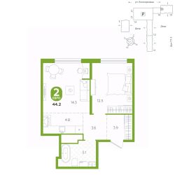 площадь квартиры - 44,2 кв.мГармоничные пропорции и большие окна наполняют пространство светом, создавая уютную атмосферу. Умное зонирование позволяет удобно организовать как рабочую, так и жилую зоны, что особенно важно для современных жителей. Санузел спроектирован с учетом всех потребностей: здесь есть ванна и место для стиральной машины. Каждый метр квартиры используется с максимальной эффективностью, что делает эту планировку отличным выбором для тех, кто ценит комфорт и удобство.