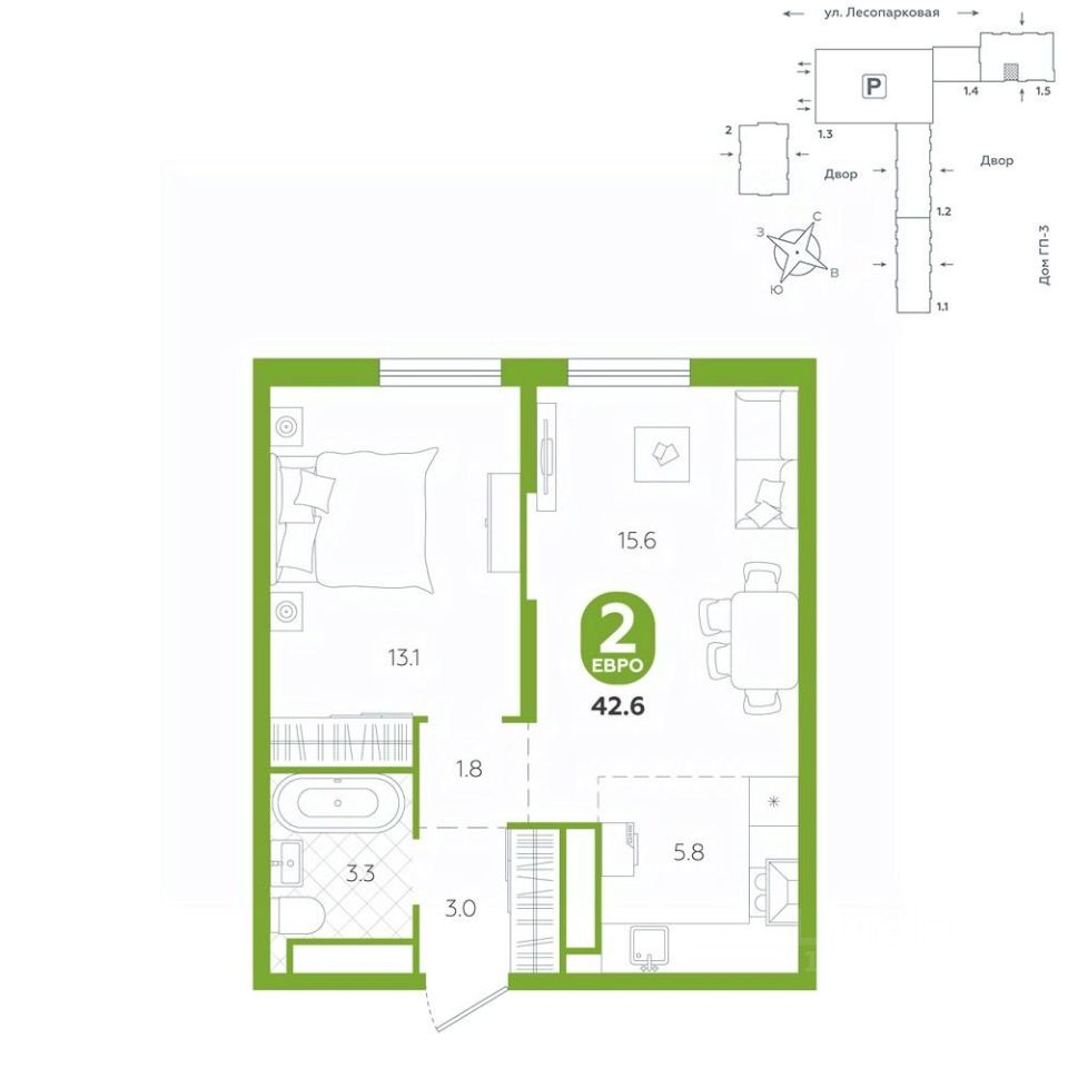 площадь квартиры - 42,6 кв.мГармоничные пропорции и большие окна наполняют пространство светом, создавая уютную атмосферу. Умное зонирование позволяет удобно организовать как рабочую, так и жилую зоны, что особенно важно для современных жителей. Санузел спроектирован с учетом всех потребностей: здесь есть ванна и место для стиральной машины. Каждый метр квартиры используется с максимальной эффективностью, что делает эту планировку отличным выбором для тех, кто ценит комфорт и удобство.