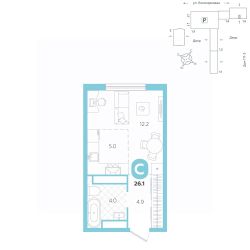 площадь квартиры - 26,1 кв.мГармоничные пропорции и большие окна наполняют пространство светом, создавая уютную атмосферу. Умное зонирование позволяет удобно организовать как рабочую, так и жилую зоны, что особенно важно для современных жителей. Санузел спроектирован с учетом всех потребностей: здесь есть ванна и место для стиральной машины. Каждый метр квартиры используется с максимальной эффективностью, что делает эту планировку отличным выбором для тех, кто ценит комфорт и удобство.