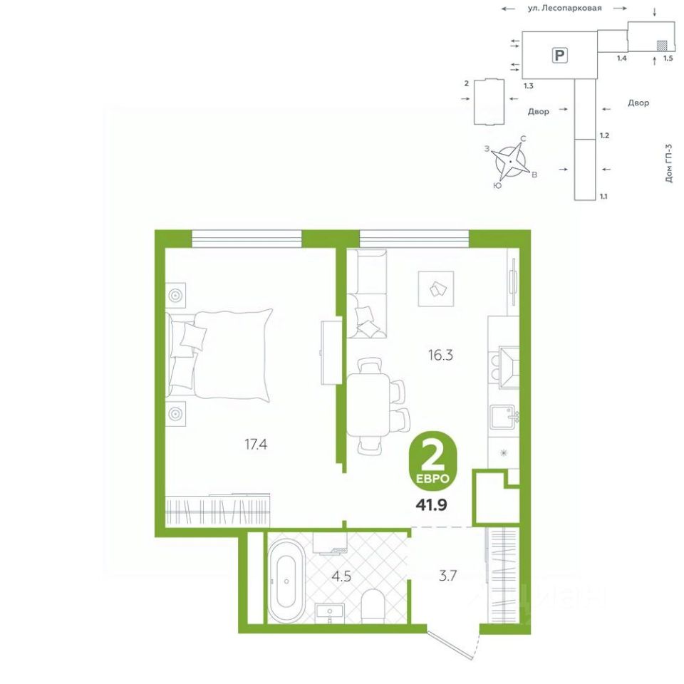 площадь квартиры - 41,9 кв.мГармоничные пропорции и большие окна наполняют пространство светом, создавая уютную атмосферу. Умное зонирование позволяет удобно организовать как рабочую, так и жилую зоны, что особенно важно для современных жителей. Санузел спроектирован с учетом всех потребностей: здесь есть ванна и место для стиральной машины. Каждый метр квартиры используется с максимальной эффективностью, что делает эту планировку отличным выбором для тех, кто ценит комфорт и удобство.