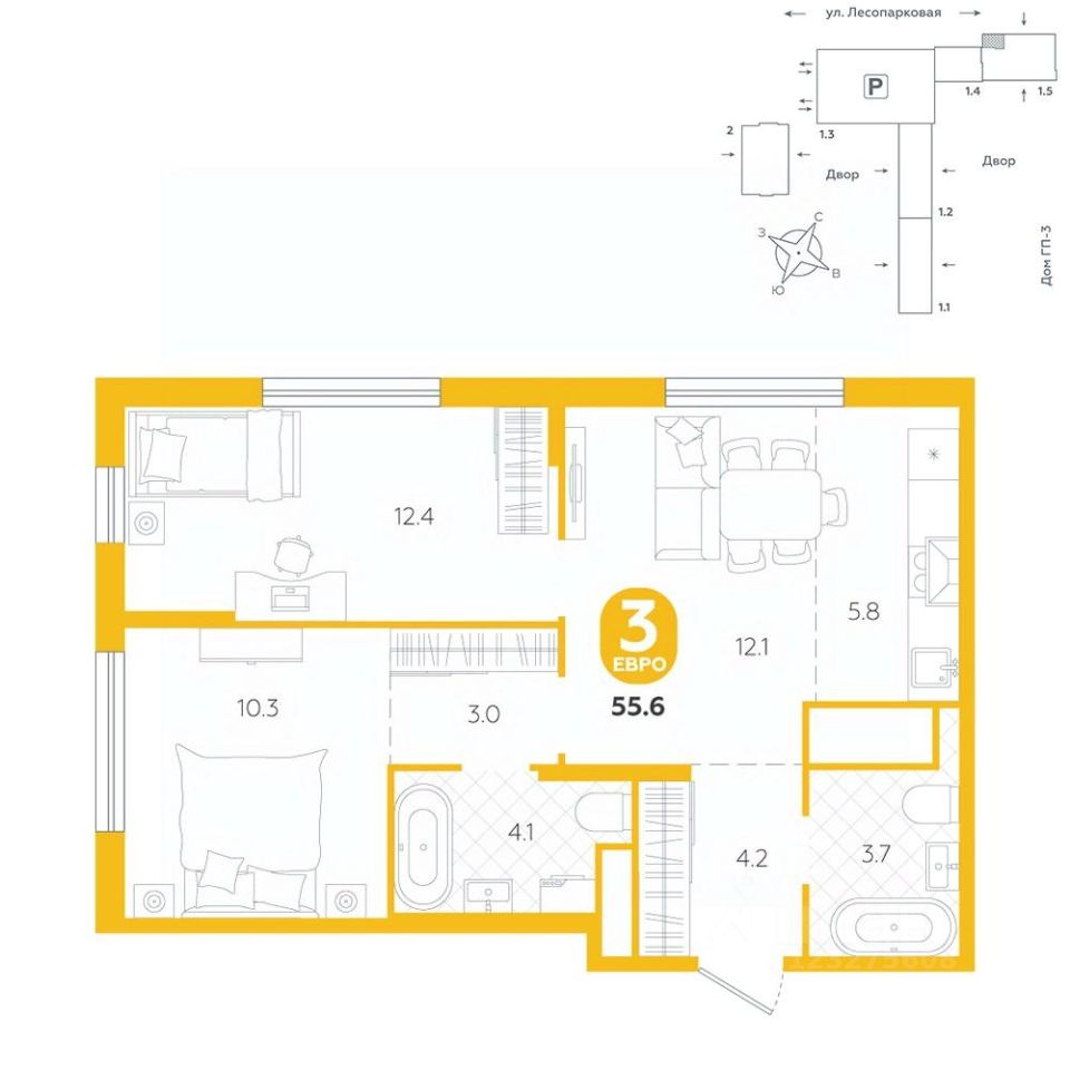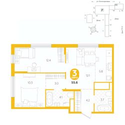 площадь квартиры - 55,6 кв.мГармоничные пропорции и большие окна наполняют пространство светом, создавая уютную атмосферу. Умное зонирование позволяет удобно организовать как рабочую, так и жилую зоны, что особенно важно для современных жителей. Санузел спроектирован с учетом всех потребностей: здесь есть ванна и место для стиральной машины. Каждый метр квартиры используется с максимальной эффективностью, что делает эту планировку отличным выбором для тех, кто ценит комфорт и удобство.