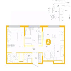 площадь квартиры - 61,1 кв.мГармоничные пропорции и большие окна наполняют пространство светом, создавая уютную атмосферу. Умное зонирование позволяет удобно организовать как рабочую, так и жилую зоны, что особенно важно для современных жителей. Санузел спроектирован с учетом всех потребностей: здесь есть ванна и место для стиральной машины. Каждый метр квартиры используется с максимальной эффективностью, что делает эту планировку отличным выбором для тех, кто ценит комфорт и удобство.