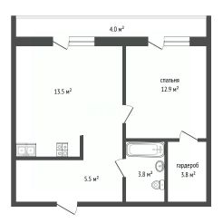 Просторная кухня- гостиная с нишей под кухонный гарнитур с выходом на балкон. Уютная спальня правильной формы с гардеробной, но можно сделать рабочий кабинет. Со спальни также имеется выход на балкон. С/у совмещён, при входе ниша под шкаф купе.