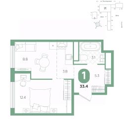 Гармоничные пропорции и большие окна наполняют пространство светом, создавая уютную атмосферу. Умное зонирование позволяет удобно организовать как рабочую, так и жилую зоны, что особенно важно для современных жителей. Санузел спроектирован с учетом всех потребностей: здесь есть ванна и место для стиральной машины. Каждый метр квартиры используется с максимальной эффективностью, что делает эту планировку отличным выбором для тех, кто ценит комфорт и удобство.