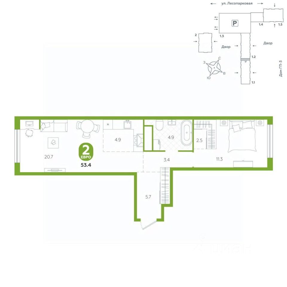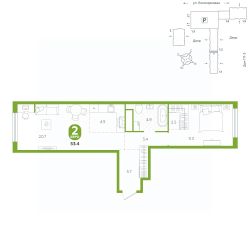 площадь квартиры - 53,4 кв.мГармоничные пропорции и большие окна наполняют пространство светом, создавая уютную атмосферу. Умное зонирование позволяет удобно организовать как рабочую, так и жилую зоны, что особенно важно для современных жителей. Санузел спроектирован с учетом всех потребностей: здесь есть ванна и место для стиральной машины. Каждый метр квартиры используется с максимальной эффективностью, что делает эту планировку отличным выбором для тех, кто ценит комфорт и удобство.
