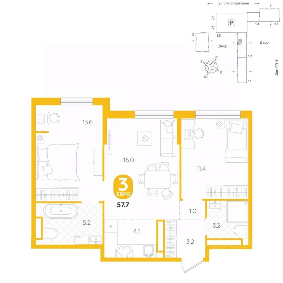 площадь квартиры - 57,7 кв.мГармоничные пропорции и большие окна наполняют пространство светом, создавая уютную атмосферу. Умное зонирование позволяет удобно организовать как рабочую, так и жилую зоны, что особенно важно для современных жителей. Санузел спроектирован с учетом всех потребностей: здесь есть ванна и место для стиральной машины. Каждый метр квартиры используется с максимальной эффективностью, что делает эту планировку отличным выбором для тех, кто ценит комфорт и удобство.