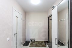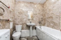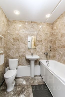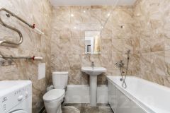Квартира с современным ремонтом в нейтральных оттенках. Санузел совмещенный облицован кафелем, установлена ванна, унитаз, раковина. При продаже остается все.