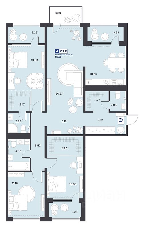 Продаётся 4-комнатная квартира в строящемся доме (ГП-1 (Менжинского, 10к1)), срок сдачи: III-кв. 2027, общей площадью 105.21 кв.м., на 4 этаже. Новый жилой комплекс от Специализированного застройщика "Звезда" расположен по адресу: г. Тюмень, по ул. Менжинского.