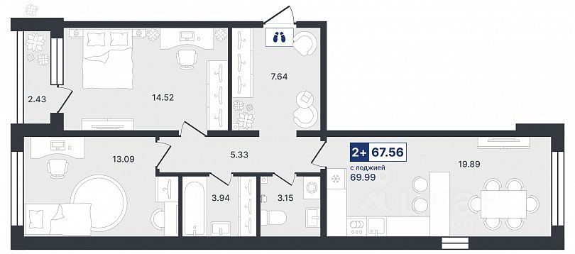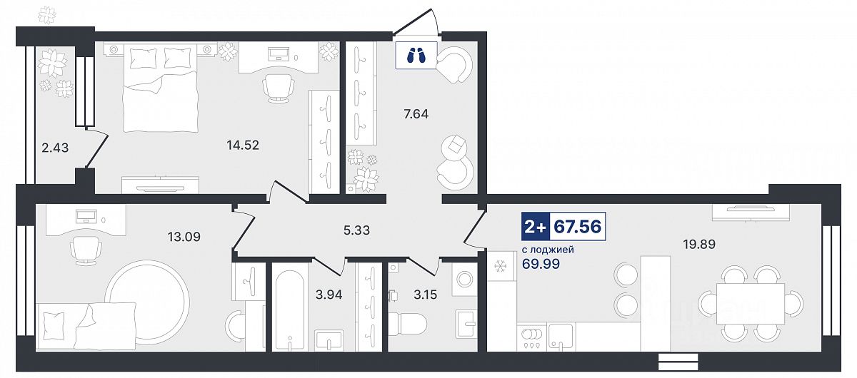 Продаётся 2-комнатная квартира в строящемся доме (ГП-2 (Ставропольская, 1к4)), срок сдачи: IV-кв. 2026, общей площадью 67.56 кв.м., на 2 этаже. Новый жилой комплекс "Один плюс один" от Специализированного застройщика "Звезда" расположен по адресу: г. Тюмень, ул. Ставропольская, 1А.