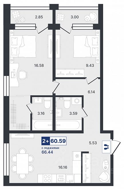Продаётся 2-комнатная квартира в строящемся доме (ГП-2 (Ставропольская, 1к4)), срок сдачи: IV-кв. 2026, общей площадью 60.59 кв.м., на 3 этаже. Новый жилой комплекс "Один плюс один" от Специализированного застройщика "Звезда" расположен по адресу: г. Тюмень, ул. Ставропольская, 1А.