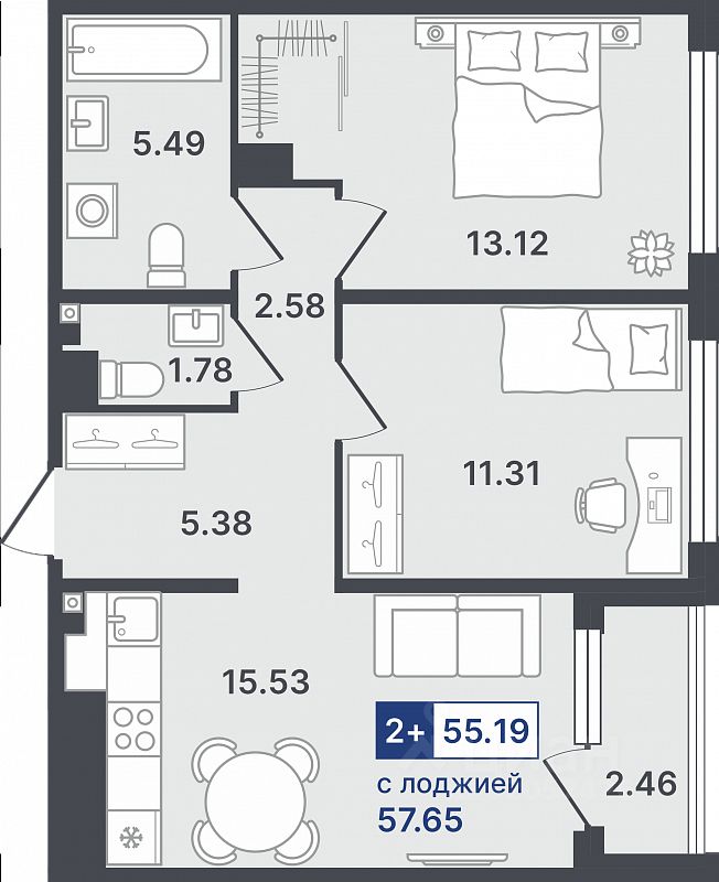 Продаётся 2-комнатная квартира в строящемся доме (ГП-2 (Сергиенко, д. 1)), срок сдачи: IV-кв. 2026, общей площадью 55.19 кв.м., на 6 этаже. Новый жилой комплекс от Специализированного застройщика "Звезда" расположен по адресу: г. Тюмень, по ул. Стройотрядовская.