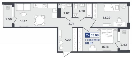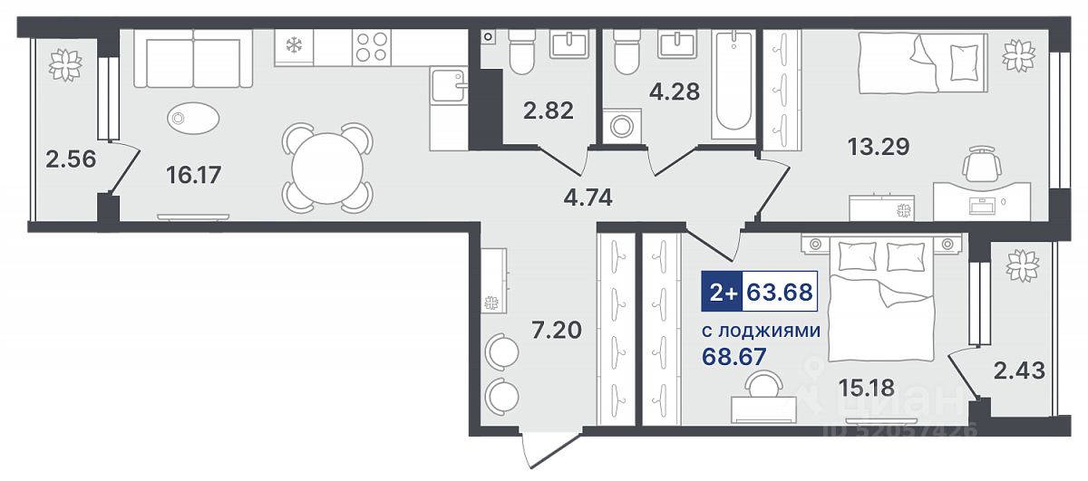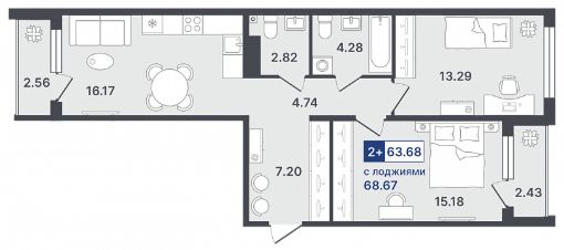 Продаётся 2-комнатная квартира в строящемся доме (ГП-1 (Стройотрядовская, д. 4)), срок сдачи: II-кв. 2026, общей площадью 63.68 кв.м., на 8 этаже. Новый жилой комплекс от Специализированного застройщика "Звезда" расположен по адресу: г. Тюмень, по ул. Стройотрядовская.
