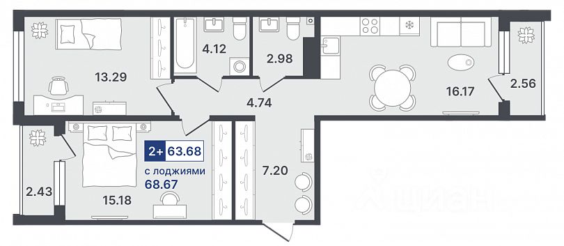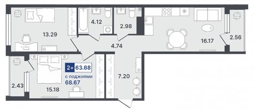 Продаётся 2-комнатная квартира в строящемся доме (ГП-1 (Стройотрядовская, д. 4)), срок сдачи: II-кв. 2026, общей площадью 63.68 кв.м., на 4 этаже. Новый жилой комплекс от Специализированного застройщика "Звезда" расположен по адресу: г. Тюмень, по ул. Стройотрядовская.