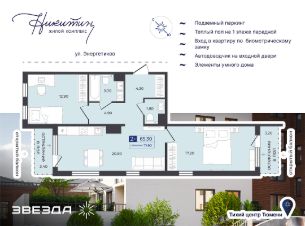 Продаётся 2-комнатная квартира в строящемся доме (Никитин), срок сдачи: IV-кв. 2025, общей площадью 65.3 кв.м., на 8 этаже. Новый жилой комплекс "Никитин" от застройщика СЗ "Звезда" расположен по адресу: Россия, Тюмень, улица Энергетиков, 42Б.