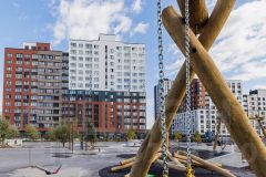 Пространство с велосипедными и пешеходными дорожками, большими деревьями, кустами и газонами, магазинами, детскими спортивными площадками, местами для автомобилей и другими элементами благоустройства.
