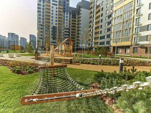 Закрытый двор с ландшафтным дизайном, зелёным газоном, детскими и спортивными площадками,