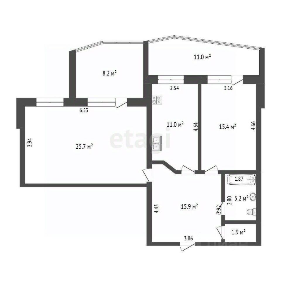 - 2 комнаты: зал с 2 окнами площадью 25 кв.м и спальня 15 кв. м; кухня - 11 кв. м, 2 лоджии (8 и 11 кв. м), одна утеплена и может быть использована как кабинет или хозбыт комната.