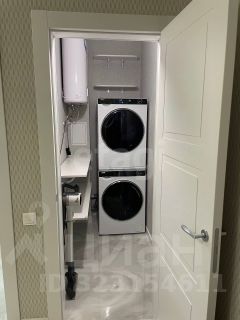 - совмещенный санузел. Душевая зона выполнена из стекла и кераморанита. Постирочная зона 2х2 вмещает колонну из сушильной и стиральной машин и полок.