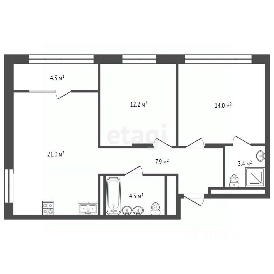 У квартиры просторная кухня-гостиная 21 кв.м, две комнаты, одна из которых с гардеробной.