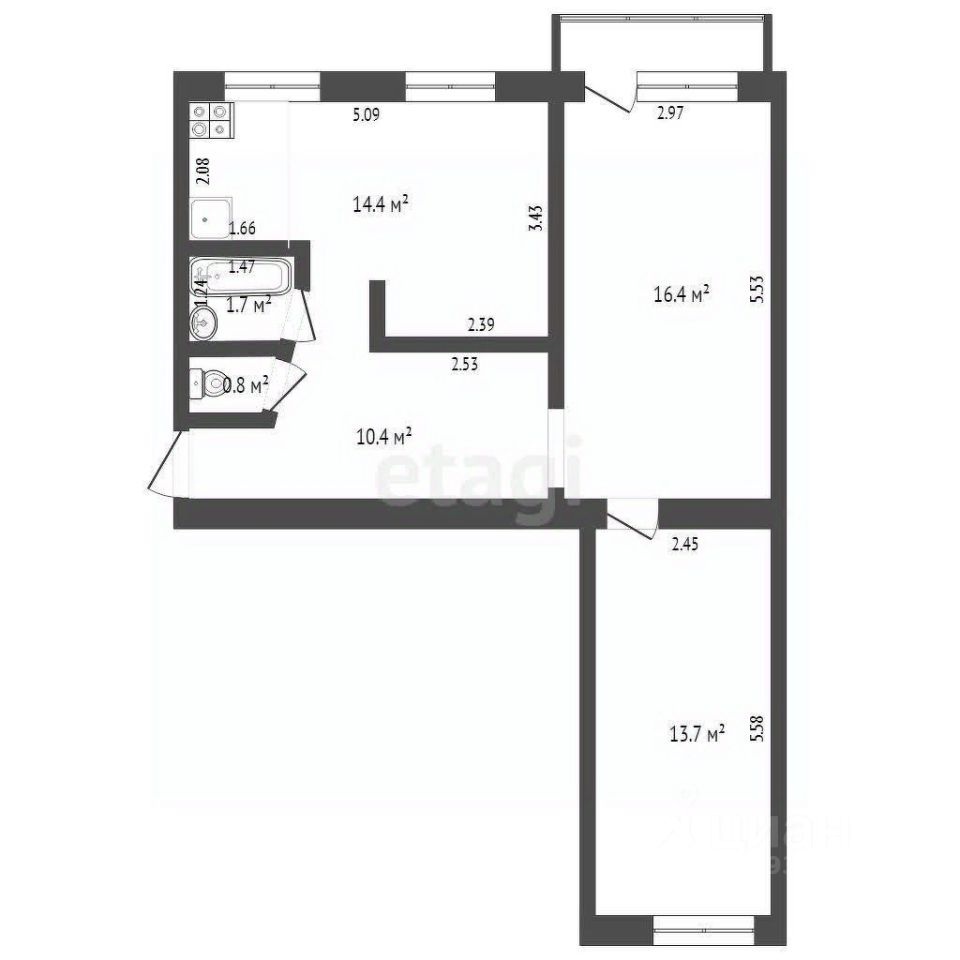 * Тип: Трехкомнатная квартира, перепланированная в двухкомнатную с кухней-гостиной.