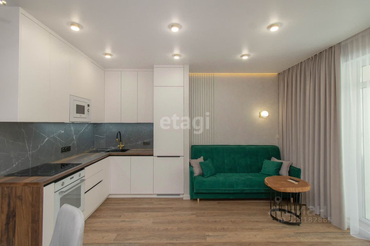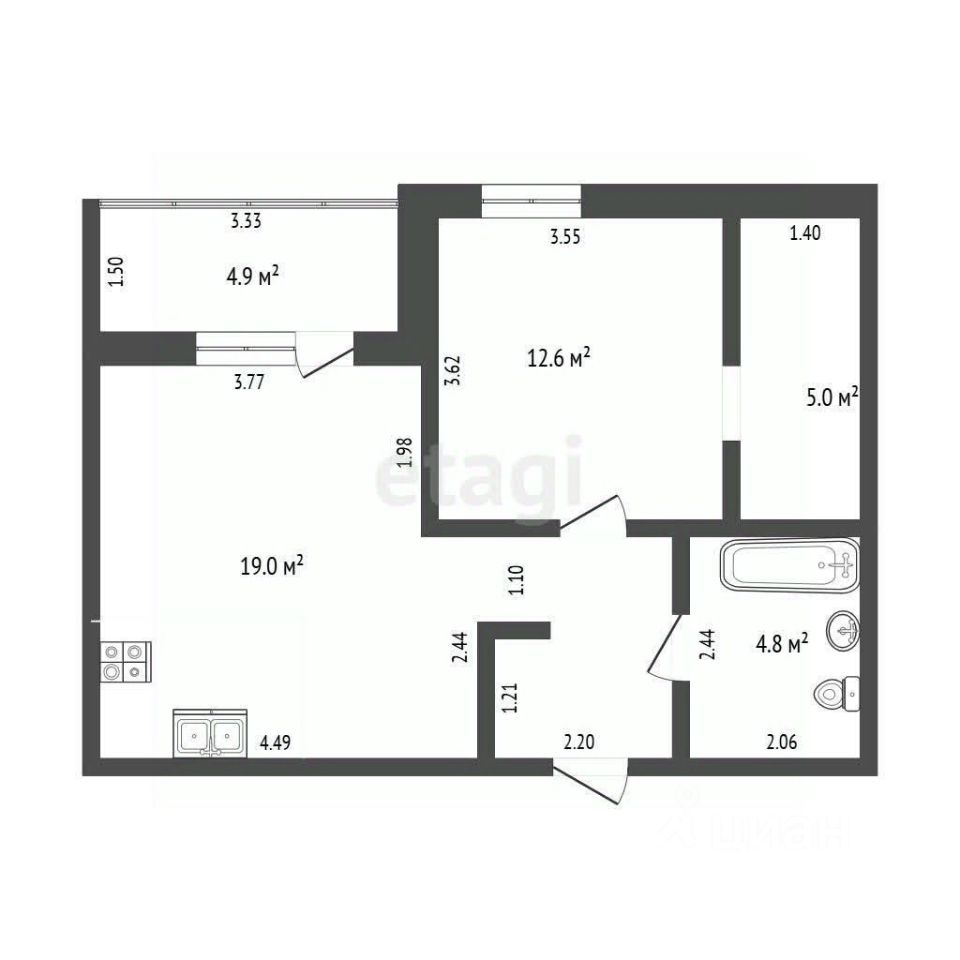 Кухня-гостиная 19 кв.м, утепленный балкон 5,2 кв.м., гардеробная 4,7 кв.м, спальня 13 кв.м, ванна 6 кв.м.