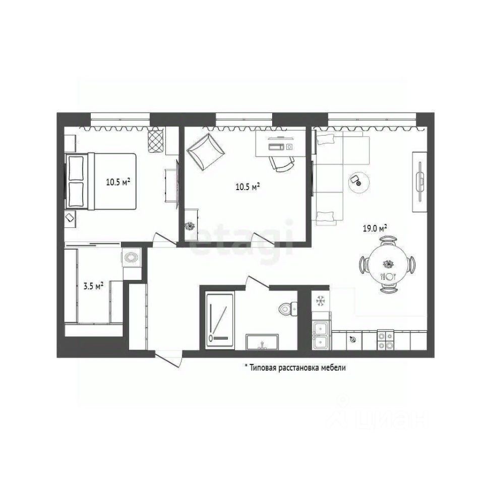 2. Формат два плюс - одно из самых востребованных решений: просторная кухня-гостиная 19 кв.м, где комфортно разместились зоны приготовления, столовая зона и зона отдыха, две изолированные комнаты правильной формы, в нашем случае это спальня со своей большой гардеробной и кабинет (он может стать для вас детской, гостевой комнатой, творческой мастерской), совмещенный санузел, функциональный коридор с местом под систему хранения. Все логично, удобно и комфортно.