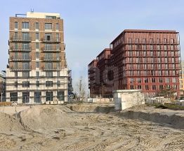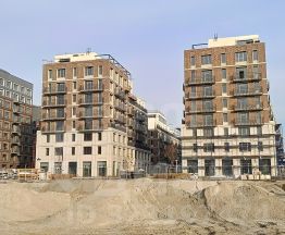 Дом переменной высоты, от 5 до 9 этажей, снижается по направлению к реке.