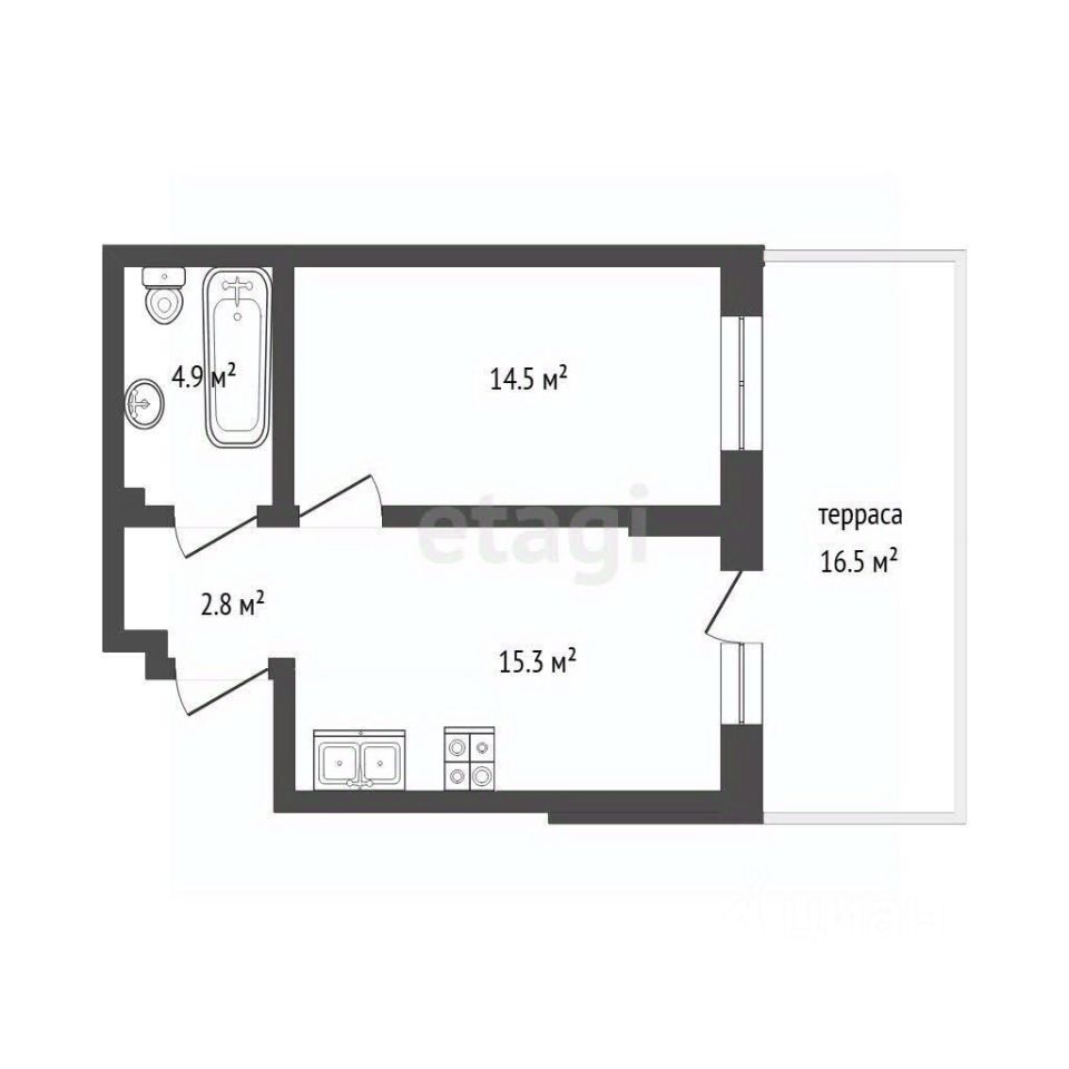 и спальня 14,5 м2, совмещенный санузел 4.9 м2, своя терраса 16.5 м2, прихожая с возможностью оборудовать гардеробную или постирочную. Высокие потолки- 3 м.