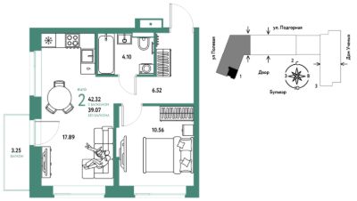 Продается 2комнатная квартира на 8 этаже от застройщика Страна Девелопмент. Площадь квартиры 42,32 кв. м.