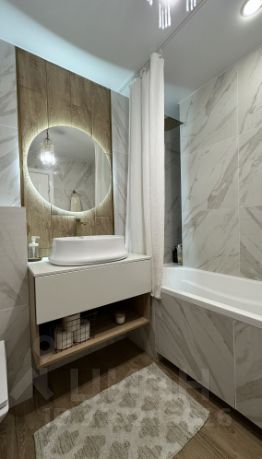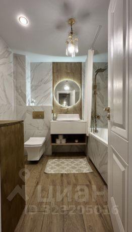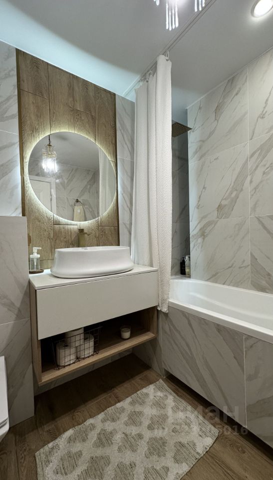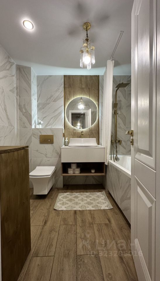 В ванне установлена инсталляция, зеркало с подсветкой, тропический душ, накопительный водонагреватель.