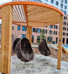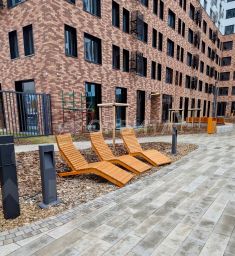 Разнообразные фасадные решения делают здания в ЖК уникальными, красивые современные дома из клинкерного кирпича с сочетанием крупноформатными окнами и витражными остеклениями построены в виде кварталов с закрытыми дворами и современными системами доступа, видеонаблюдения, бесконтактного пропуска и охраны. Здания имеют разную этажность для защиты от ветра и вида на город, высокие секции обеспечивают максимальное освещение, а низкие — тёплую и светлую атмосферу.