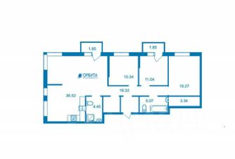 Планировка включает в себя просторная кухня-гостиная 34,32 м²,