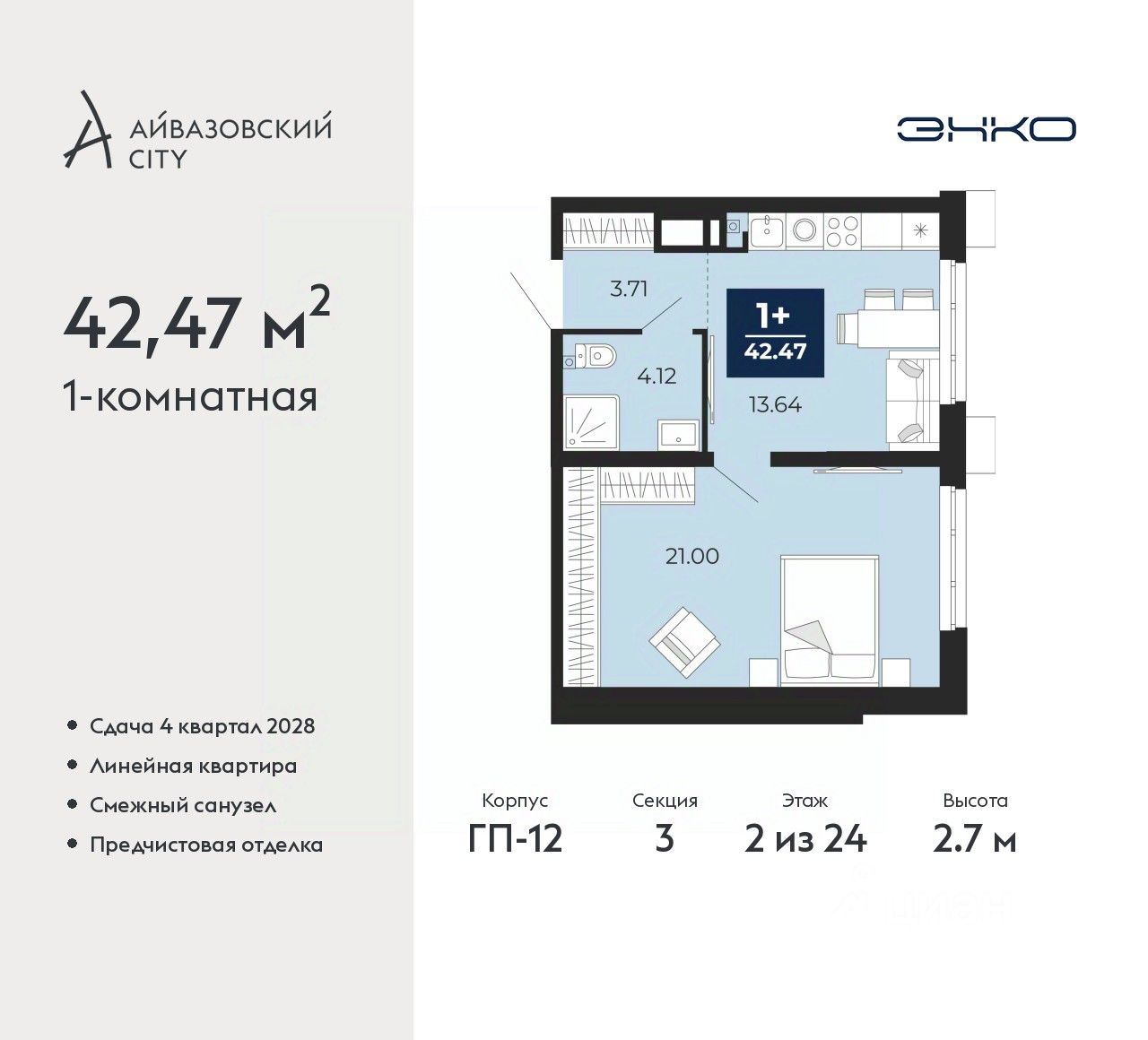 1-комн. квартира от застройщика с предчистовой отделкой в ЖК "Айвазовский City" на 2 этаже. Общая площадь: 42.47 кв.м., жилая: 21 кв.м., площадь просторной кухни-столовой: 13.64 кв.м. Все окна выходят на одну сторону. В квартире один совмещенный санузел. Высота потолков 2.7 м.