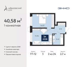 Просторная однокомнатная квартира с предчистовой отделкой в ЖК "Айвазовский City" на 2 этаже. Общая площадь: 40.58 кв.м., жилая: 14.07 кв.м., площадь просторной кухни-столовой: 15.94 кв.м. Все окна выходят на одну сторону. В квартире один совмещенный санузел. Высота потолков 2.7 м.