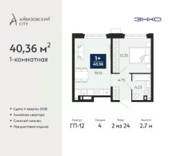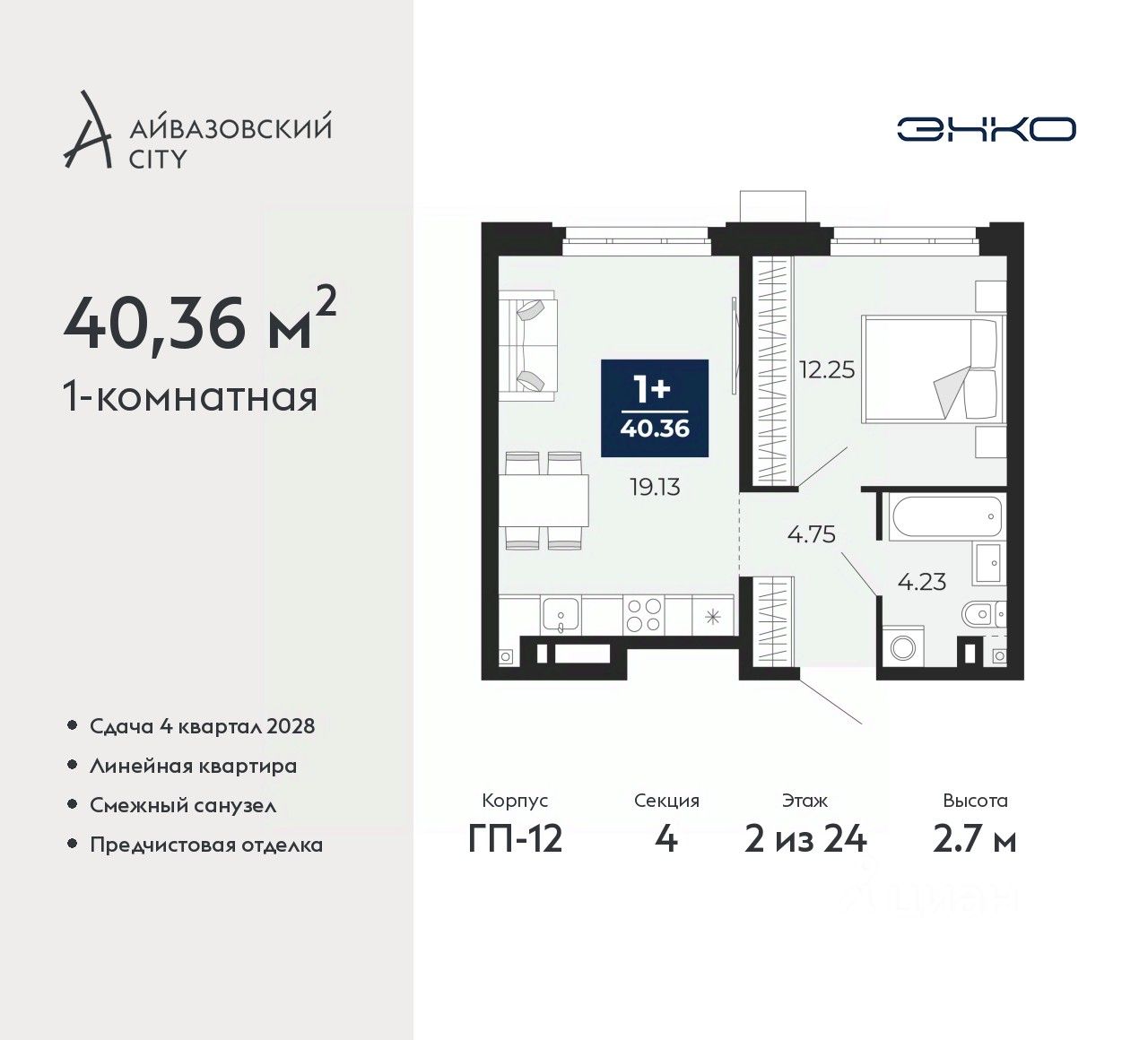 Просторная однокомнатная квартира с предчистовой отделкой в ЖК "Айвазовский City" на 2 этаже. Общая площадь: 40.36 кв.м., жилая: 12.25 кв.м., площадь просторной кухни-столовой: 19.13 кв.м. Все окна выходят на одну сторону. В квартире один совмещенный санузел. Высота потолков 2.7 м.