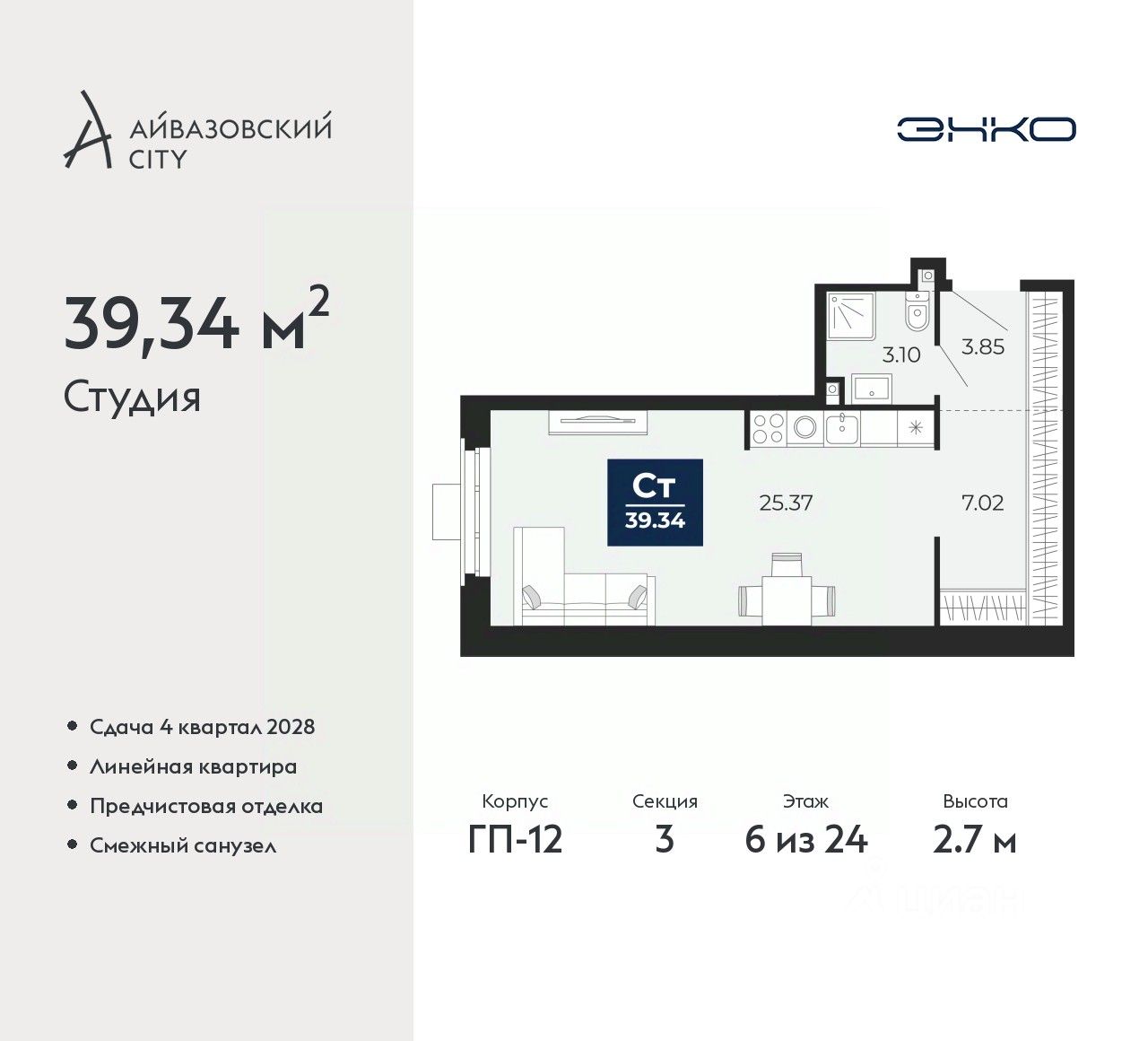 Продается 1-комн. квартира-студия от застройщика с предчистовой отделкой в ЖК "Айвазовский City" на 6 этаже. Общая площадь: 39.34 кв.м., площадь гостиной 26.37 кв.м., из которых 6 кв.м. выделено под кухонную зону. Все окна выходят на одну сторону. В квартире один совмещенный санузел. Высота потолков 2.7 м.