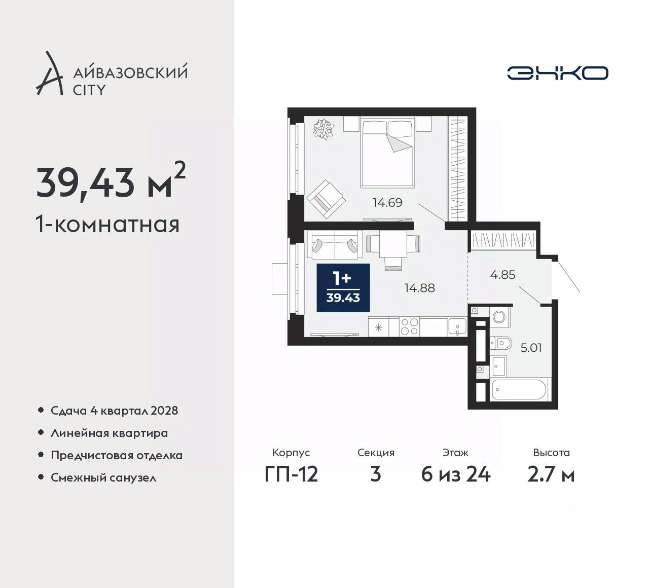 Продается 1-комн. квартира с предчистовой отделкой в ЖК "Айвазовский City" на 6 этаже. Общая площадь: 39.43 кв.м., жилая: 14.69 кв.м., площадь просторной кухни-столовой: 14.88 кв.м. Все окна выходят на одну сторону. В квартире один совмещенный санузел. Высота потолков 2.7 м.